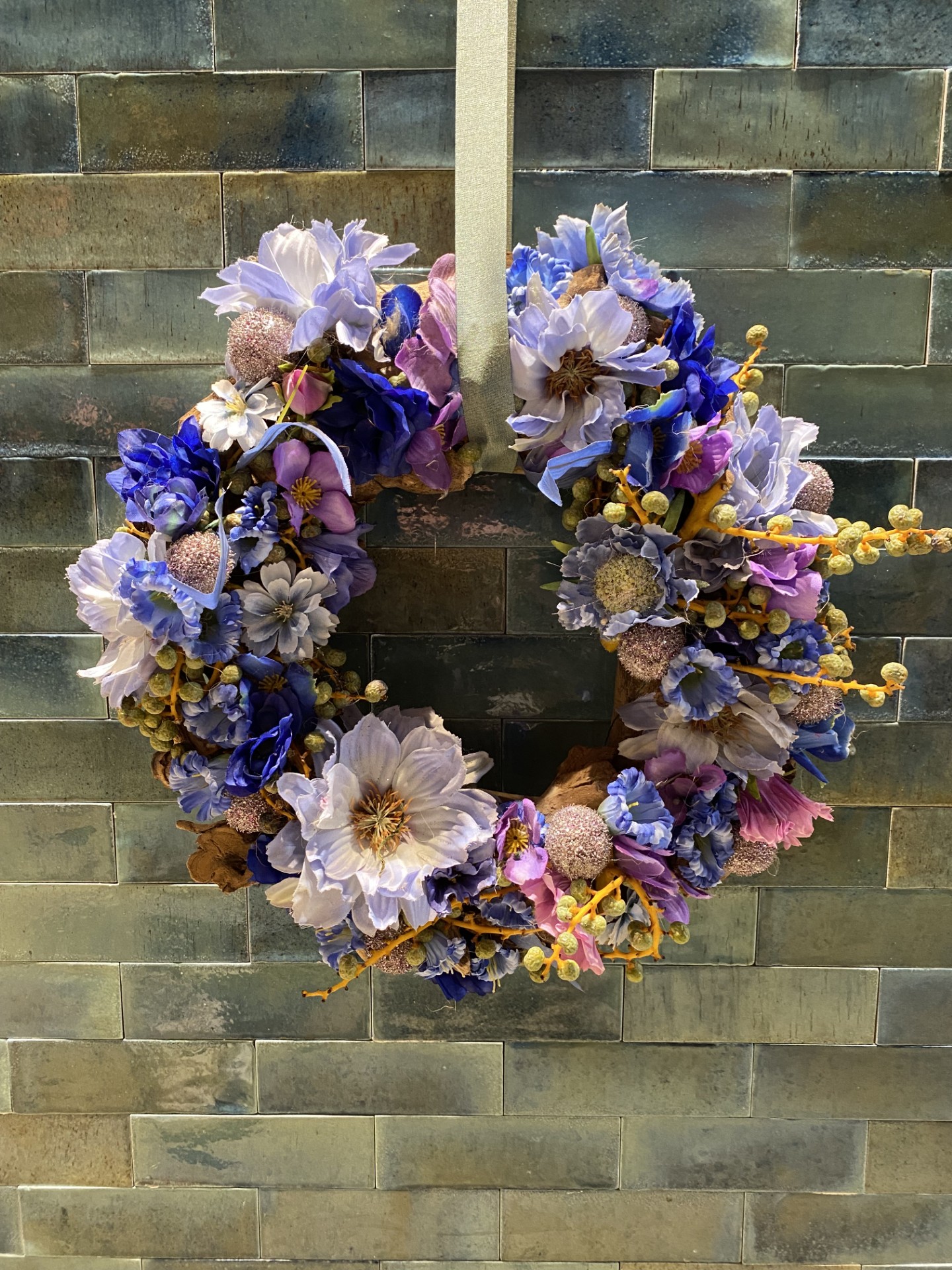 Deze krans heeft zijn mooie kleuren doormiddel van zijden bloemen. De basis is van drijfhout en dadelpalm. Zo blijft deze krans altijd zo mooi als nu.