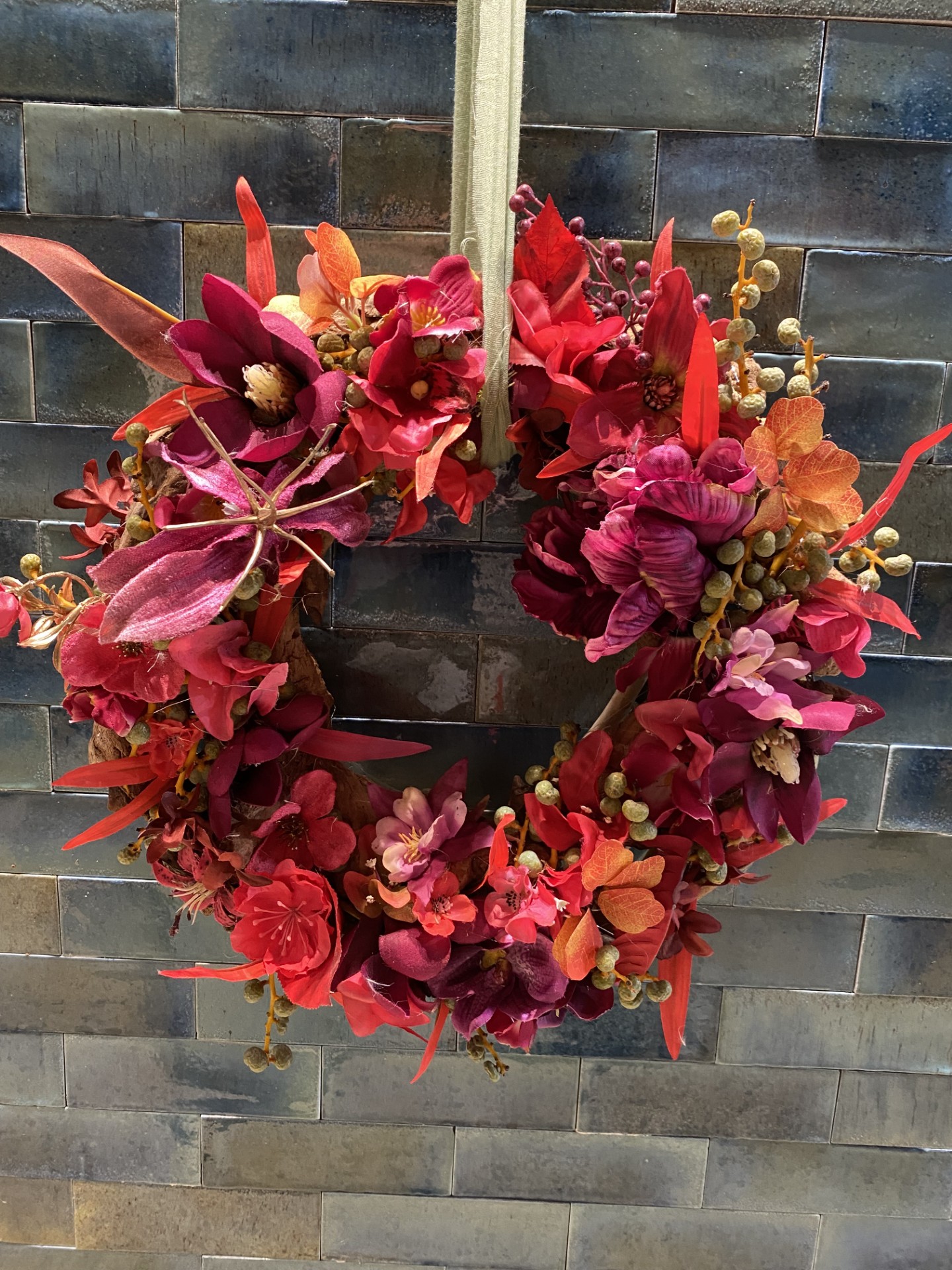 Deze krans heeft zijn mooie kleuren doormiddel van zijden bloemen. De basis is van drijfhout en dadelpalm. Zo blijft deze krans altijd zo mooi als nu.