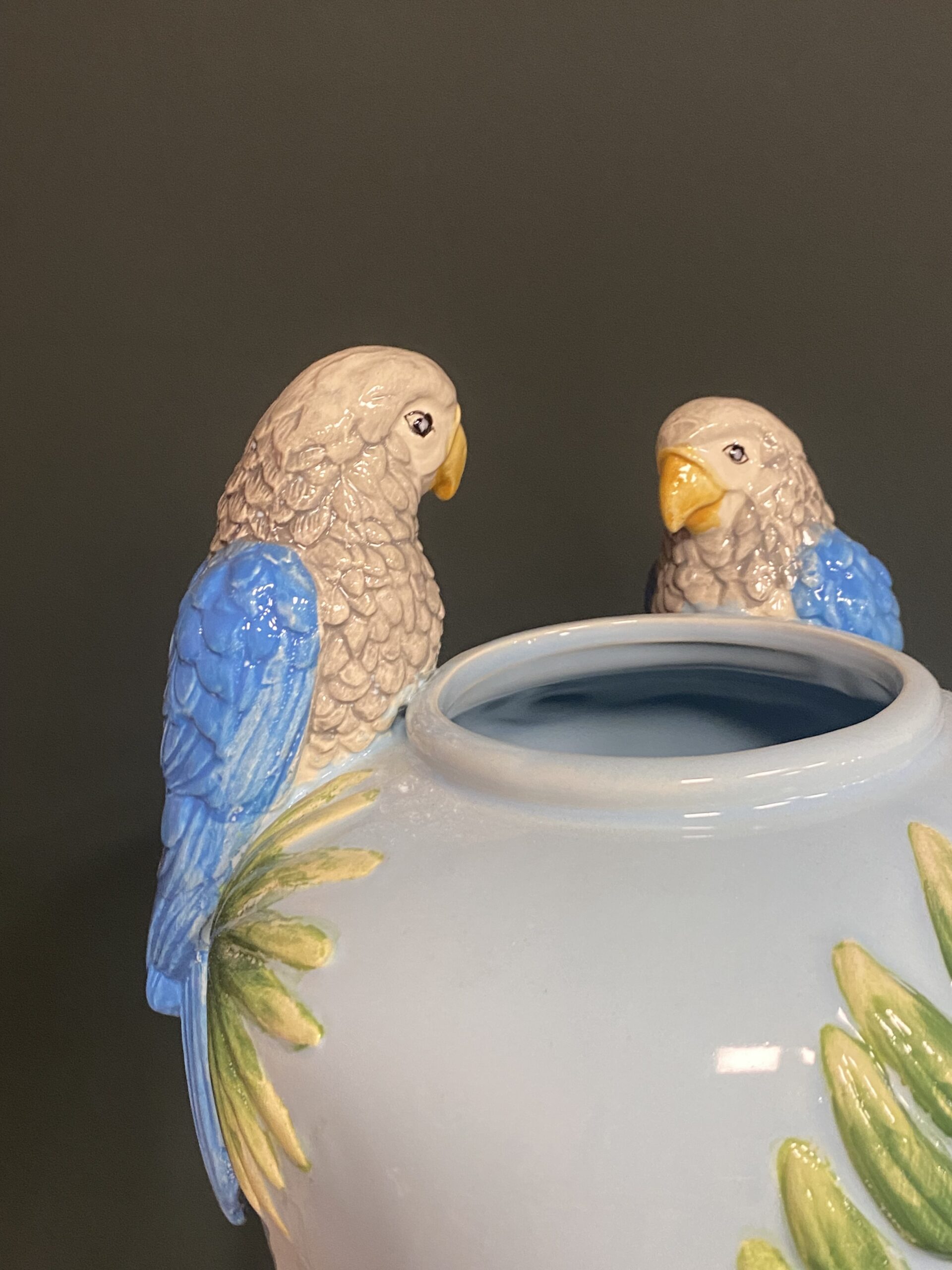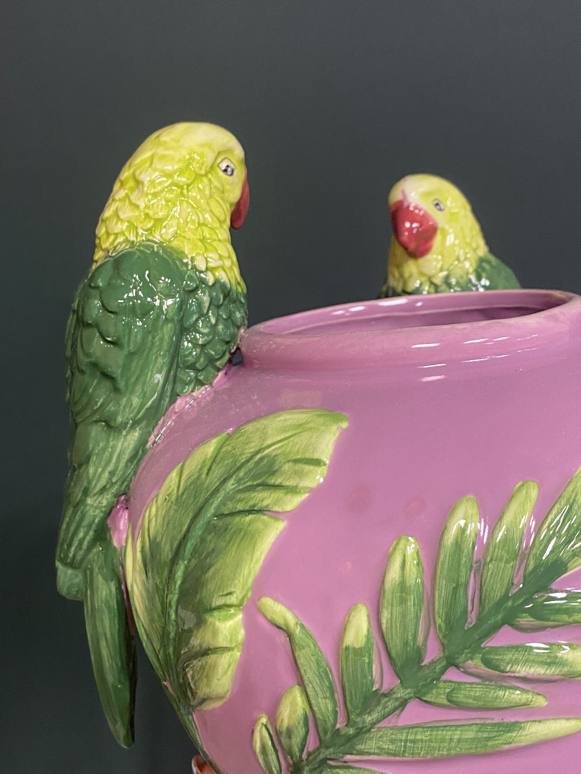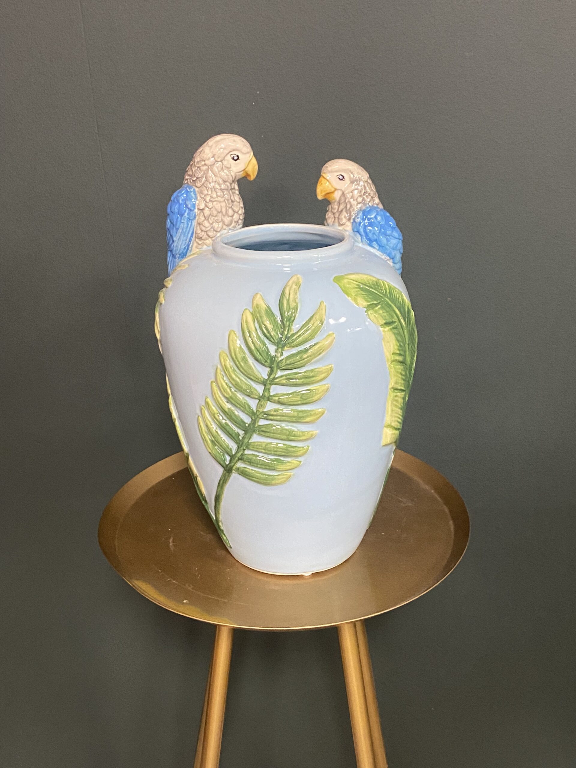 Haal een tropische tint in huis met deze vrolijke papegaaien vaas.