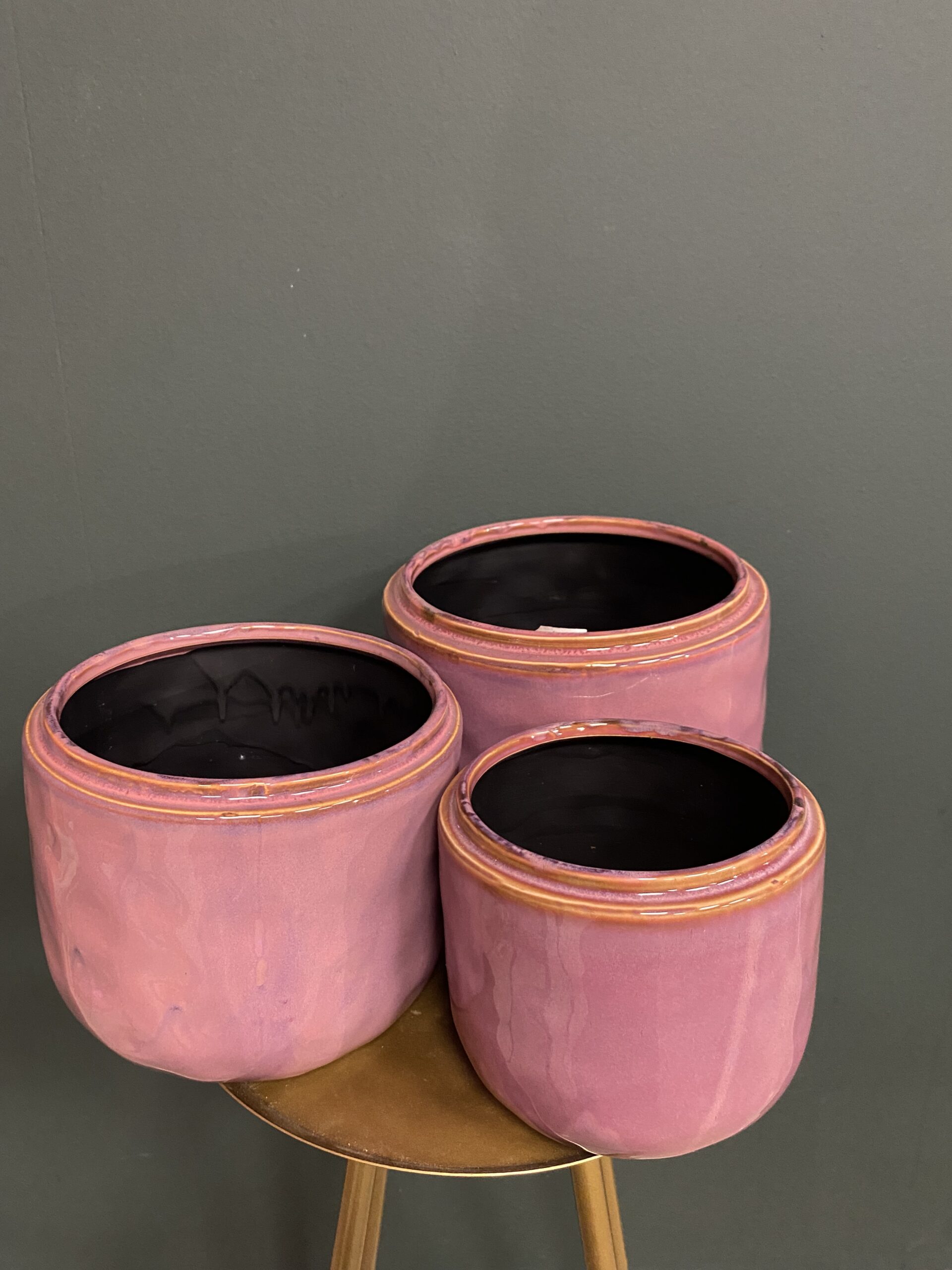 Stijlvolle keramieken bloempotten, verkrijgbaar in drie maten. Een warme roze tint met subtiel kleurverschil in het glazuur voor een speelse afwerking.