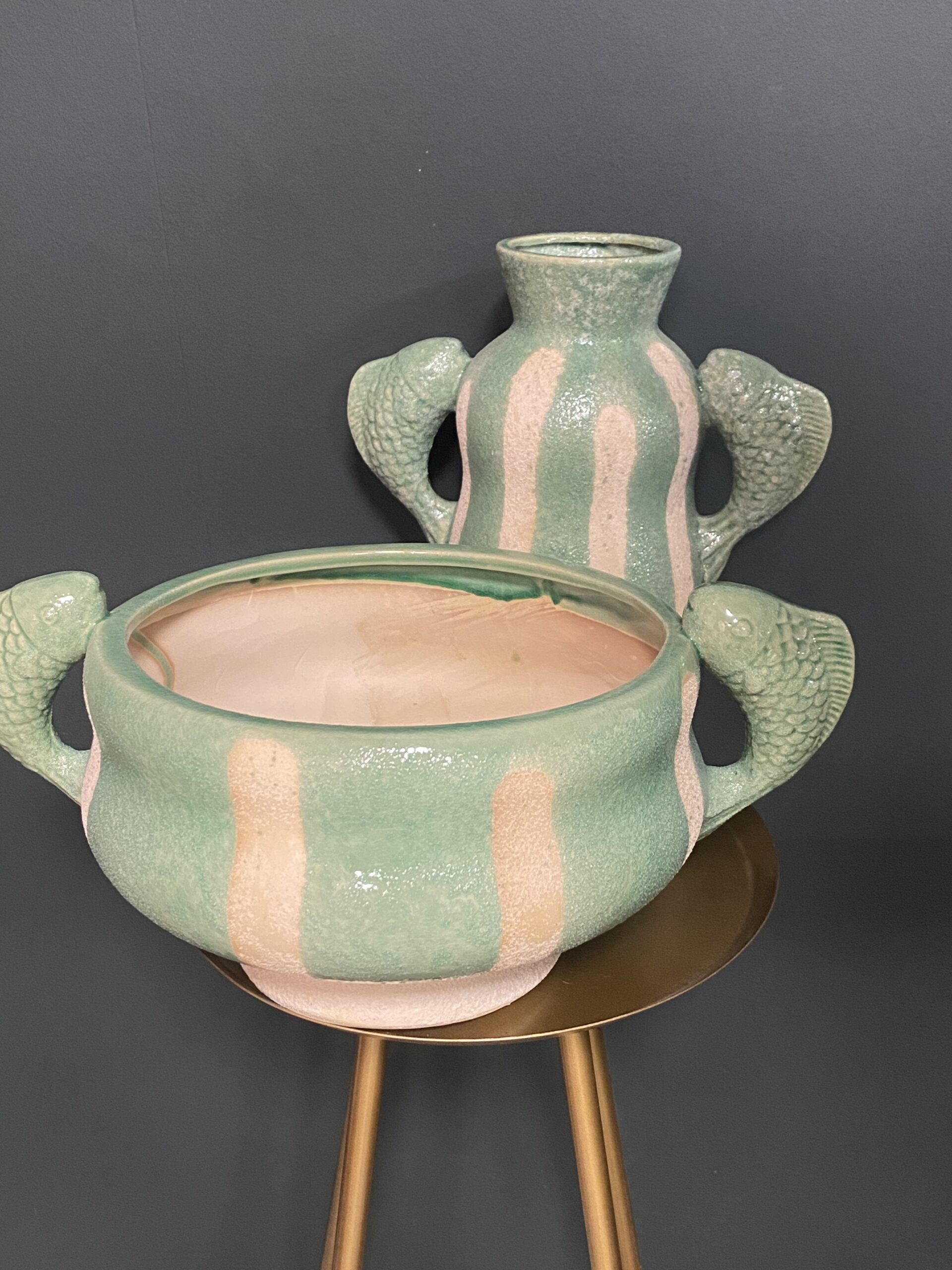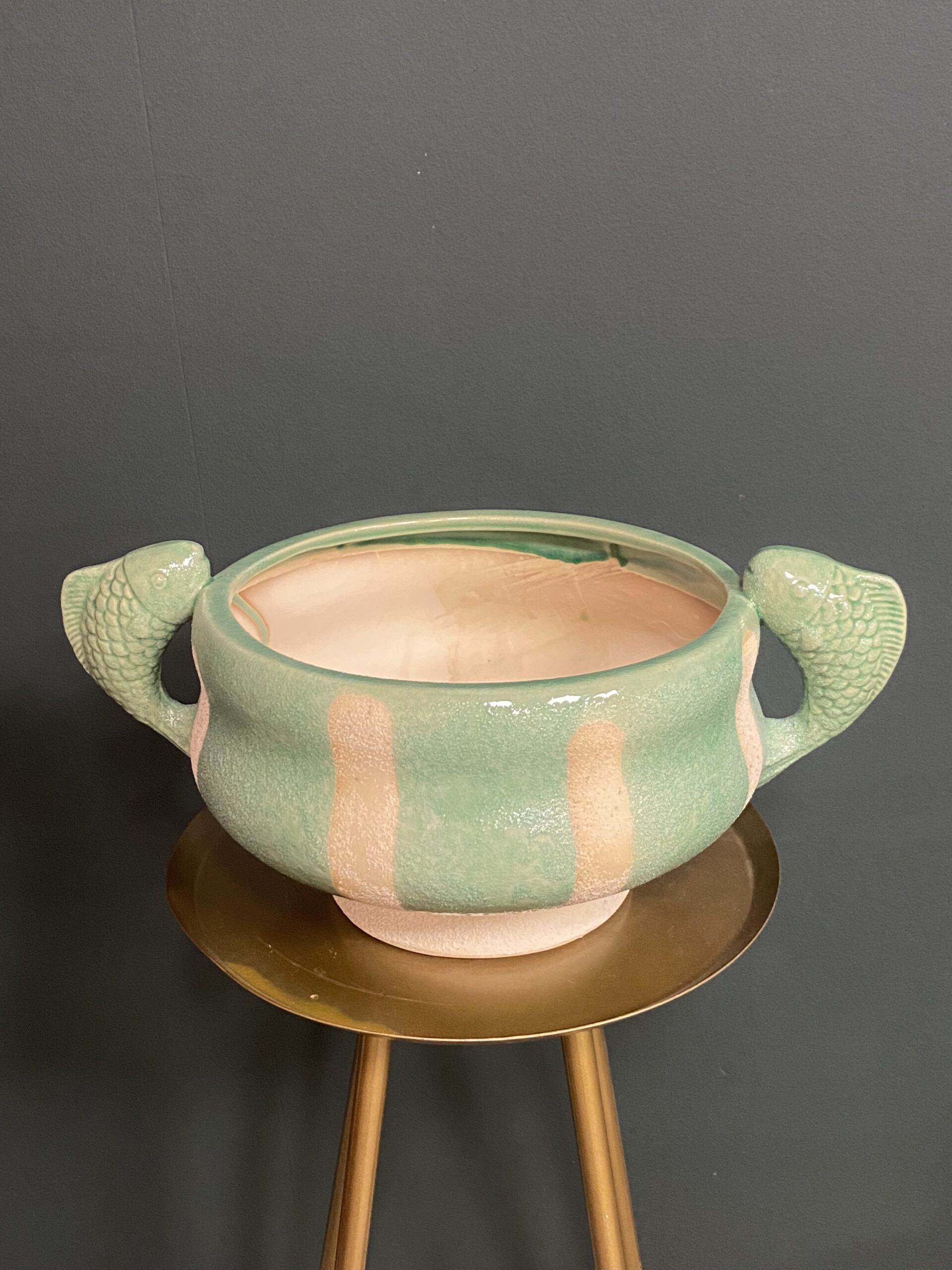 Deze bijzondere schaal heeft zachte groene tint in combinatie met natuurlijke accenten geeft een rustige, maar toch speelse uitstraling. De handgrepen in de vorm van vissen zorgen voor een karaktervol detail.